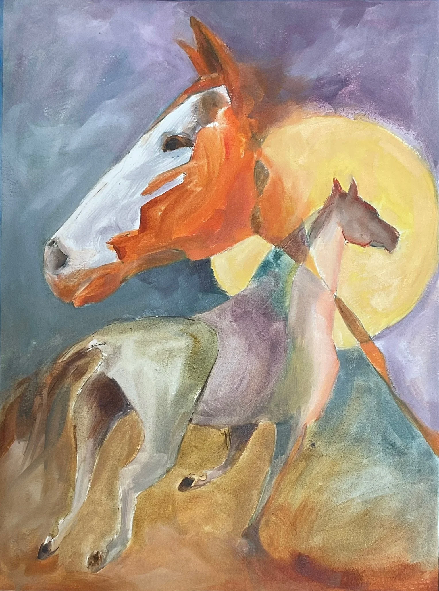 My paintings burst with life—playful, confrontational, langorous, ecstatic. Through light, shadow, and color, I express the resonance I feel in the presence of horses. My work translates the longing for understanding between horses, myself, and viewers.